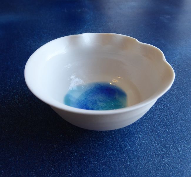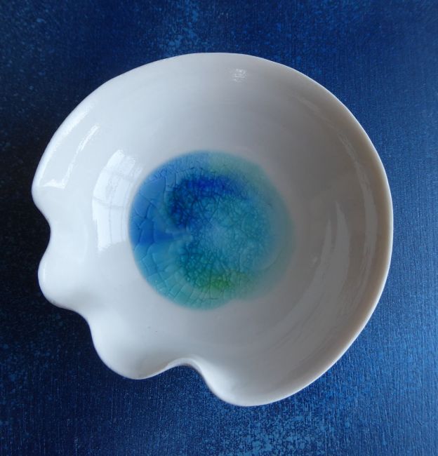 Seaglass glaze on porcelain. 4cms high x 11cms diameter.