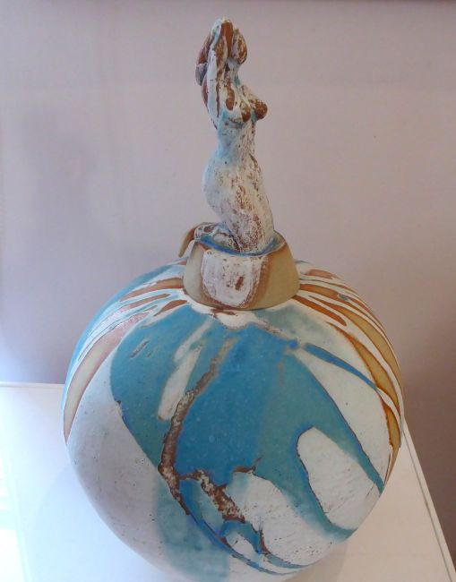 Ceramic vessel with lid and matt slip glaze. Diameter 21cms, 32cms high.